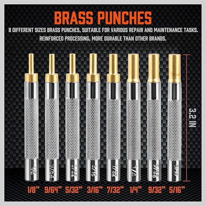 - BRASS PUNCHES – 8 sizes from 1/8" to 5/16", designed to protect delicate surfaces where steel punches may cause damage