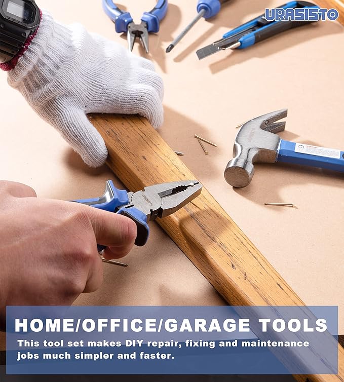 - ⚙WIDELY APPLICATIONS -- This tools kit is perfect for repairmen, construction workers, mechanics to do household repairing, picture hanging, box opening, screw tightening, cutting, measuring, furniture assembling and woodwork at home, garage dormitory, and workshop. It’s also an ideal gift for family or friends.