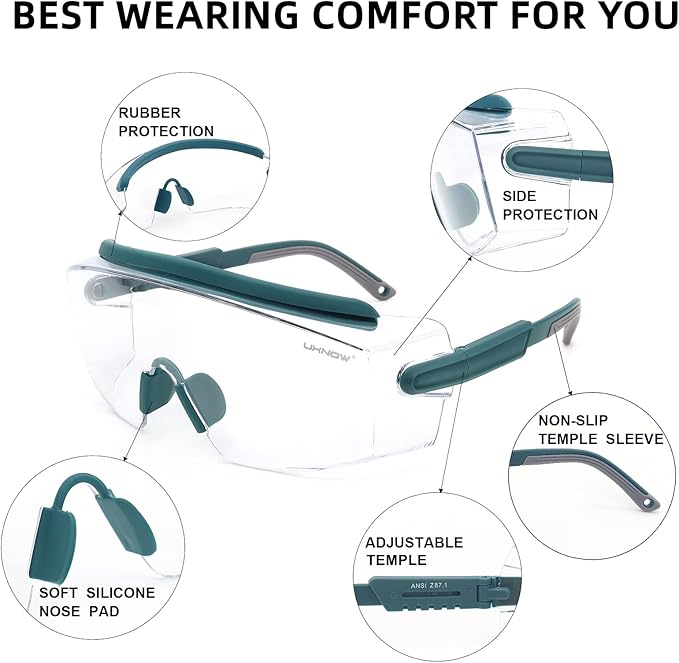 UKNOW Safety Goggles Over Glasses, Anti Fog Safety Glasses with Clear Wraparound Lens, ANSI Z87.1 Protective Eyewear