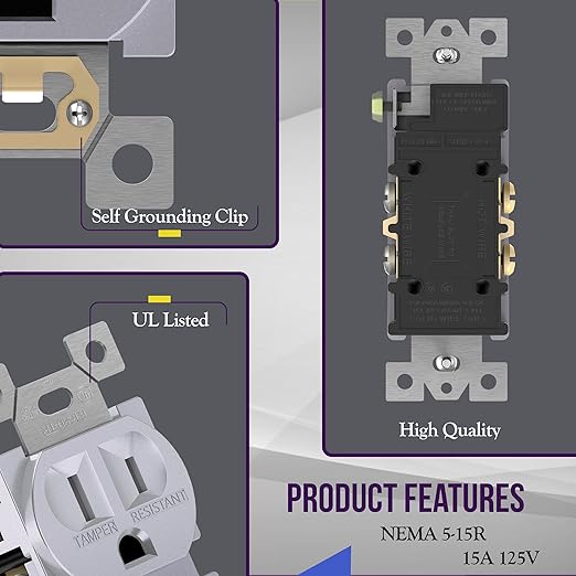 - 10 pack; silver color; includes installation screws; 15A 125VAC, 5-15R; flammability UL94, V2 Rating; UL Listed; 1-year warranty