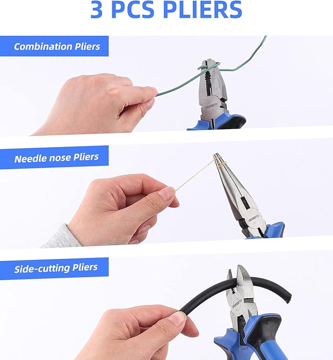 - 【4 PLIERS INCLUDED】The tool kit contains the 4 most commonly used pliers: 7” linesmen pliers, 6” long nose pliers, 10” groove joint pliers, 6” diagonal cutting pliers