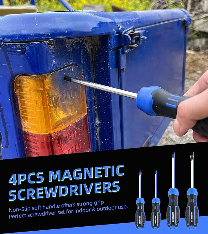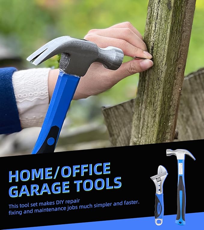 - 【62-PIECE USEFUL TOOL SET】This tool set comes with the update most useful tools: hammer×1, screwdrivers×4, utility knife×1, blades×5 , 10ft/3m measuring tape×1, insulation tape×1, pliers×4, storage box×1, hex keys×9, adjustable wrench×1, assortment driver bits×20, sockets×12, 2-in-1 screwdriver holder and socket handle×1