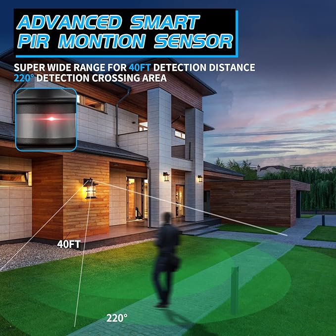 - 【Wider Lighting Area & Detection Range】Auto turn on at night and turn off during the day. The updated motion sensor wall light can be triggered by moving people, cars, or animals. The sensing distance of up to 40FT and a detection angle of up to 220°, which can provide excellent lighting for your warm home and illuminate the dim space. Our outside light is more sensitive than the general outdoor house lights, the detection distance is longer. A good partner to provide the foundation of safety.