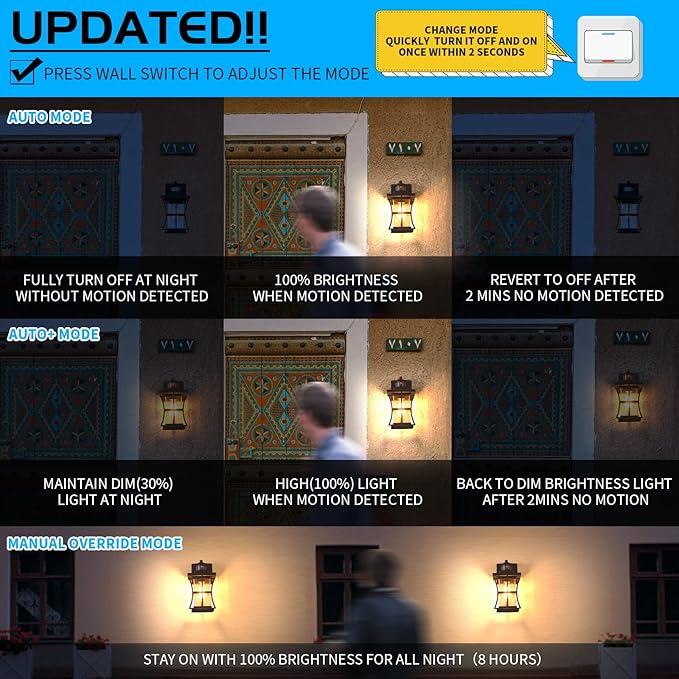 - 【Intelligent PIR Motion Activated & Dusk to Dawn IC Sensor】Our high sensitivity motion sensor outdoor light can provide smart lighting with 3 modes. Mode①: The outdoor wall light could fully off with no motion actived and turn to 100% brightness once motion is detected at night. Mode②: The porch light keep 30% light with no motion activated at dusk, activated with 100% brightness, and back to 30% brightness after 120s. ③Manual override mode which can stay 100% brightness at night for 8H.