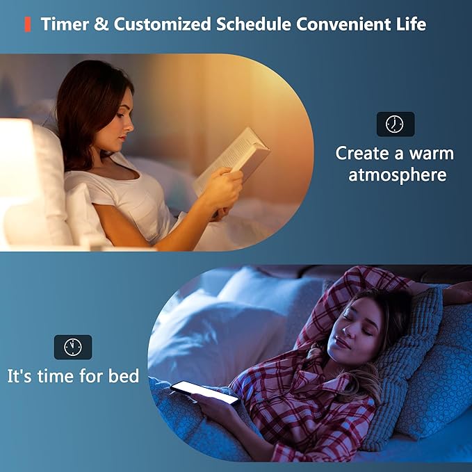 - 【Timer & Customized Scenes】Create a schedule (timer or countdown) to automatically turn on/off the light bulbs at any time you want, reminding you to wake up or go to sleep. With 16-million colors and 8 preset scene modes, you are free to DIY your own scene modes to achieve the perfect atmosphere for various occasions, like party, dating, relaxing and so on.