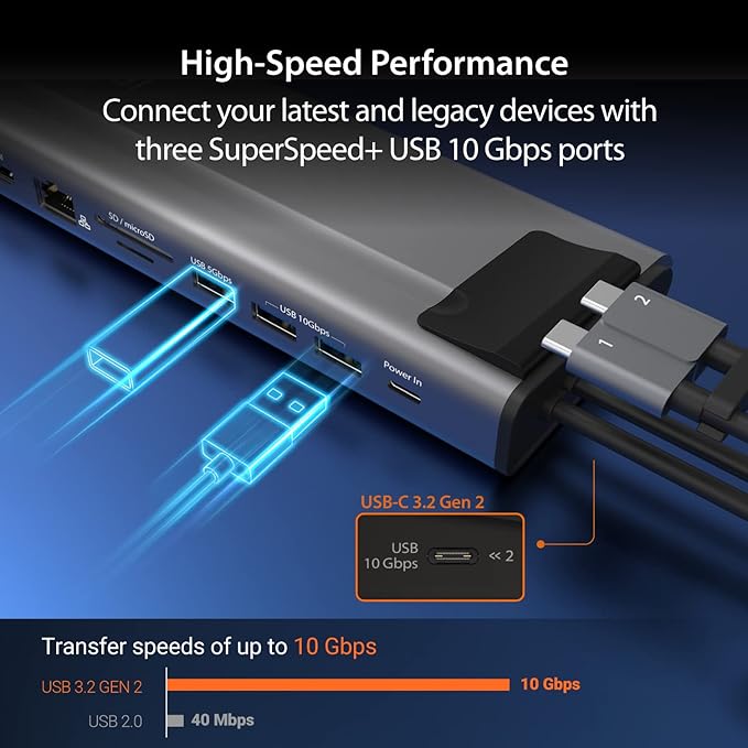 - 【HIGH-SPEED PERFORMANCE】 Provides three SuperSpeed USB 10 Gbps ports (1 USB-C and 2 USB Type-A) to connect peripherals