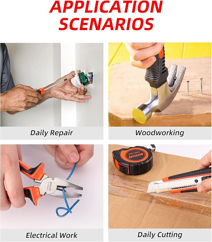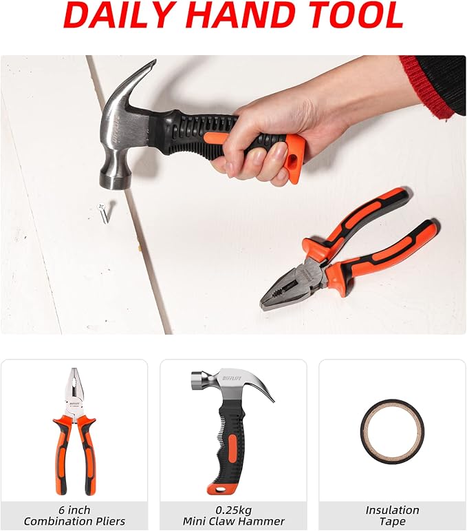 - 【Multifunctional Tool Kit】- Set includes tape measure, claw hammer, bit screwdriver,Wire pliers, precision screwdriver, Utility knife,Hardware accessories and Insulating tape.