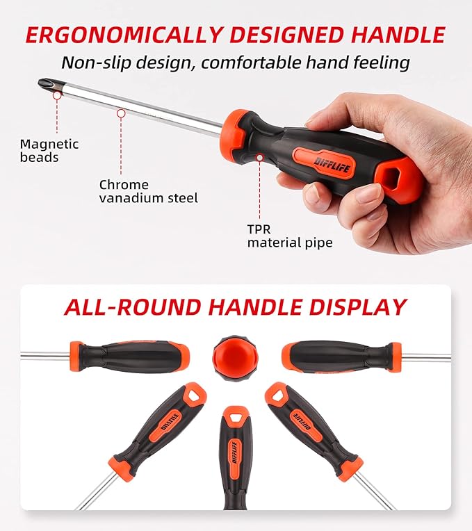- ๐ ๏ธSCREWDRIVER MATERIAL: The screwdriver shaft is made of chrome vanadium steel, which is strong and durable. It has good wear resistance after heat treatment, and chrome plating is corrosion resistant.The tpr handle conforms to the ergonomic design, the material is comfortable to the touch, and the anti-slip is better for manual work.