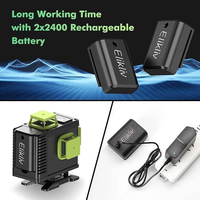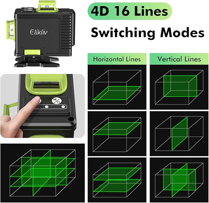 - ✅Get More from Elikliv 16 Line Laser Tool Kit✅ IP54 protection class (splash+dust protection), ideal for work on construction sites. Package list: 1 x Laser Level, 1 x Lift Platform, 1 x Magnetic Bracket, 2xRechargeable Batteries,1 rotary Base, 1 x Remote Control, 1 x Charger, 1 x Laser Target Plate,1x Green Glasses, 1 x Carry Case, 1 x Manual (Any concerns or questions for our green laser level, just feel free to contact us :)We will reply your within 🕛24 hours and do our utmost to help you :)