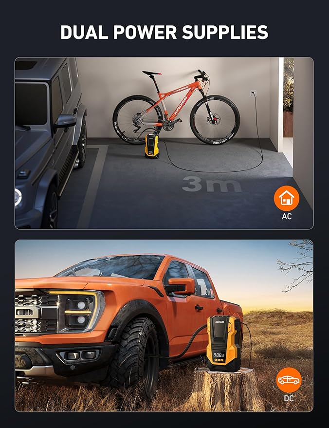 - AC/DC dual power supply design: Our portable air compressor’s multifunctional AC/DC dual power supply design can draw power from both vehicle and wall outlets. Its DC plug is designed for a 12V cigarette lighter socket while its AC plug is designed for a 110V/120V wall outlet.Includes 3 extra nozzles: Suitable for cars, motorbikes, bike tires, sports equipment, and other inflatable items. Our portable air compressor can be used indoors or on the road.