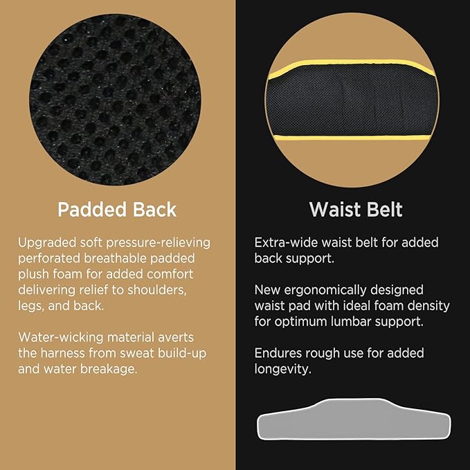 - COMFORT: Upgraded soft pressure‑relieving perforated breathable padded plush foam for added comfort delivering relief to shoulders, legs, and back. New specially formulated webbing flexes to accommodate movement and body contours for optimum comfort around legs & shoulders. Water‑wicking material averts the safety harness from sweat build-up and water breakage—essential for long days using a fall protection harness.
