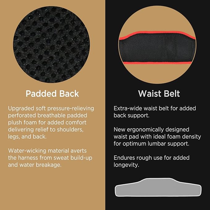 • COMFORT: Upgraded soft pressure‑relieving perforated breathable padded plush foam for added comfort delivering relief to shoulders, legs, and back. New specially formulated webbing flexes to accommodate movement and body contours for optimum comfort around legs & shoulders. Water‑wicking material averts the safety harness from sweat build-up and water breakage—essential for long days using a fall protection harness.