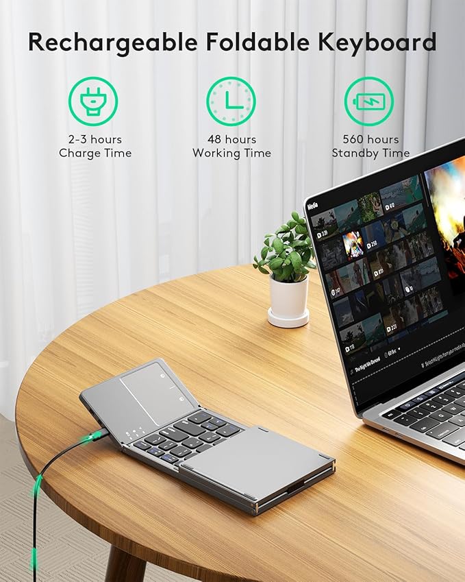 - 【Sensitive Touchpad Foldable Keyboard】Upgrade sensitive touchpad supports mouse left and right key function, so you can control the device without using mouse. Updated richer and more practical multimedia shortcut functions make your work more convenient and more efficient! Built-in rechargeable battery can last for 48 hours or 560 hours after 2-3 hours of charging. One full charge last enough for your short business trip or vacation!