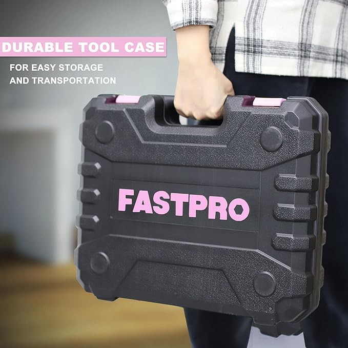 FASTPRO 177-Piece 20V Pink Cordless Lithium-ion Drill Driver and Home Tool Set, Lady's Home Repairing Tool Kit with Drill in Storage Case