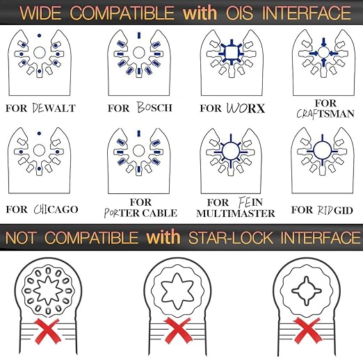 - More Compatible: The universal OIS interface system for over 95% of oscillating tools, for Dewalt, Bosch, and so on. Do not compatible with starlock interface system oscillator. (Please refer to the pictures and information page for details about the adapter model number. Incidental 2pcs extra C-clip adapter to fit more models.)