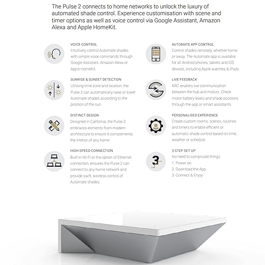 - HIGH-SPEED CONNECTION Built-in Wi-Fi or the option of Ethernet connection, ensures the Pulse 2 can connect to any home network and provide swift, wireless control of Automate shades.