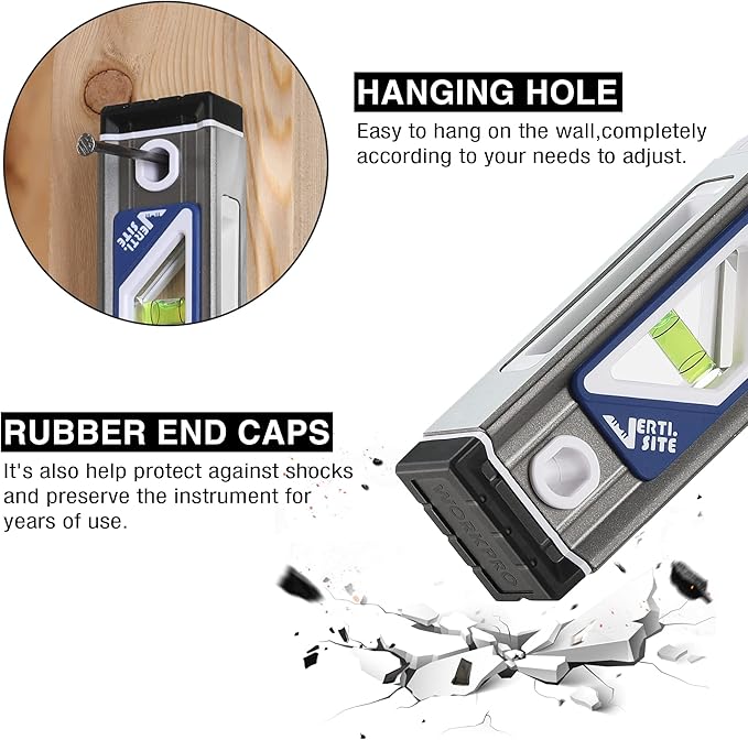 - DURABILITY - Shock-absorbing rubber end caps of the leveler tool hold up to heavy use. Aluminum body construction for durability and strength