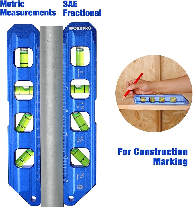WORKPRO 8-Inch Magnetic Torpedo Level, Aluminum Alloy Construction, 4 Bubble Vials for 0°/90°/45°/30° Measurements, Cobalt Blue