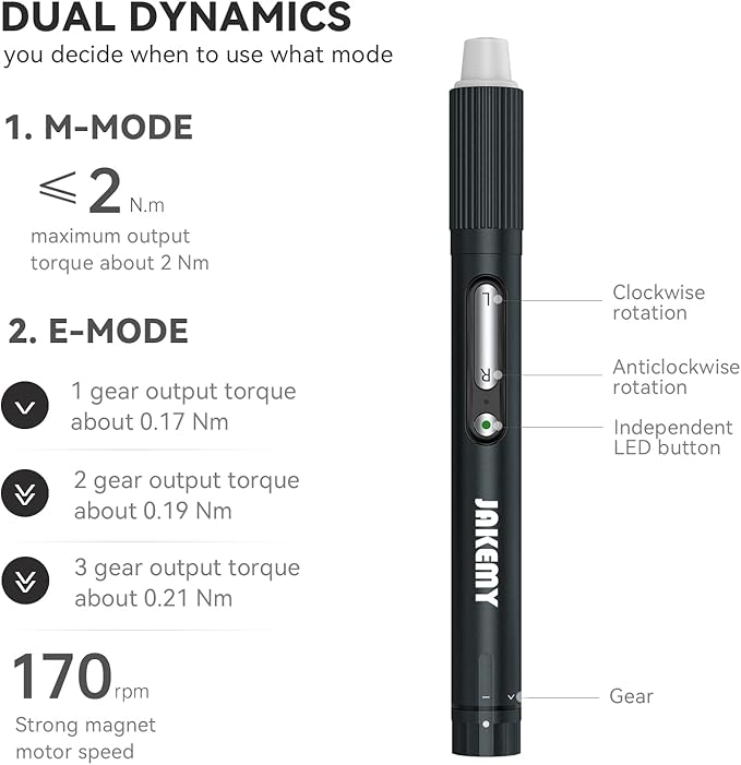 - 【DUAL DYNAMICS Electric Screwdriver】Our small electric screwdriver are available in e-mode and m-mode. Maximum output torque in m-mode is about 2 Nm, and maximum output torque of 1 gear and 2 gear and 3 gear is about 0.17 Nm and 0.19 Nm and 0.21 Nm respectively. The maximum speed of this tiny electric screwdriver is up to 170 rpm.