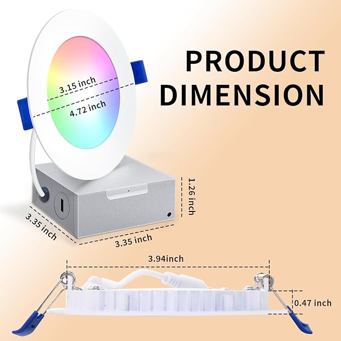 - Easy Installation - These wifi recessed light are suitable for new decoration or retrofit. Turn off all power supply before installation for safety. Cut a 105mm hole in the ceiling>>Connect the Junction Box to the power cables>>Wire up lights with j-box>>Use spring clip to fix flat recessed light fixture in the ceiling. [ Tips ] Do not use with dimmer swithches, only support ordinary wall switches(on and off type). Only support 2.4GHz wifi.