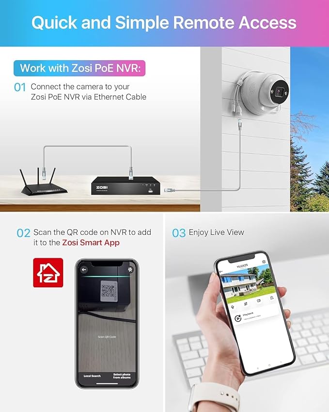 - 【Only Compatible with ZOSI 4K PoE NVRs】This PoE camera is an add-on camera. It cannot be used separately. It needs to connect the Ethernet cable and NVR to work. Only compatible with ZOSI 4K PoE NVR.(Model: ZR16HB,ZR08HN,ZR08SN,ZR16SK,ZR16HK).