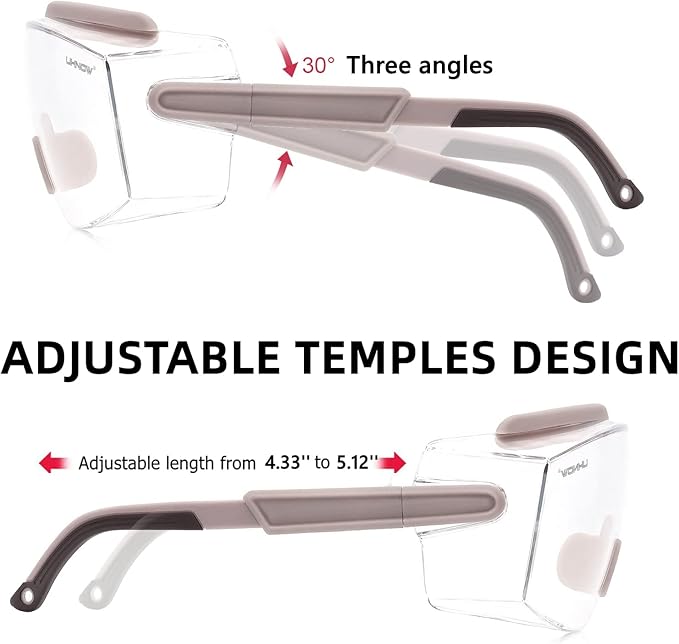 - 【OVER GLASSES SAFETY GOGGLES】These safety glasses with a one-piece polycarbonate wraparound lens are designed to protect both your eyewear and eyes. They can fit over most prescription glasses(up to 5.71 in wide, up to 1.85 in high) and also can be worn as a pair of typical safety glasses.