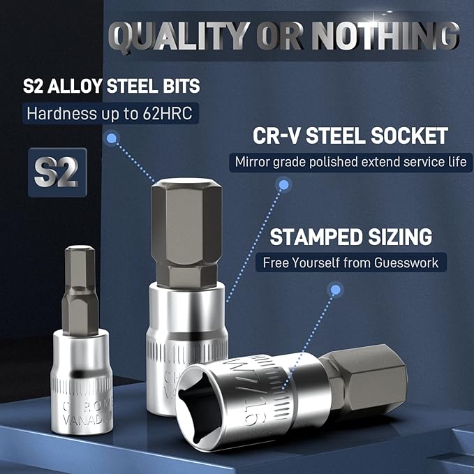- 【Premium Material】DISEN 32PC Hex Bit Socket Set are made of premium heat treated Chrome Vanadium Steel on torx socket end and heat treated S2 Alloy Steel on hex bits, a high quality material with high durability and maximum strength, and provide greater torque. Chrome plated on the surface for anti-corrosion and rust prevention
