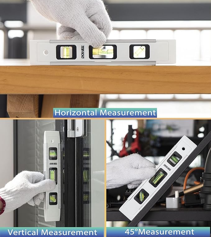 - 3 DEGREES & TOP VIEW - Horizontal, vertical and 45-degree bubble level, clear and intuitive green acrylic vials with top views, easy to read. Provides maximum readability.