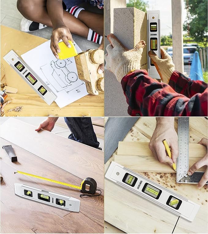 - 3 DEGREES & TOP VIEW - Horizontal, vertical and 45-degree bubble level, clear and intuitive green acrylic vials with top views, easy to read. Provides maximum readability.