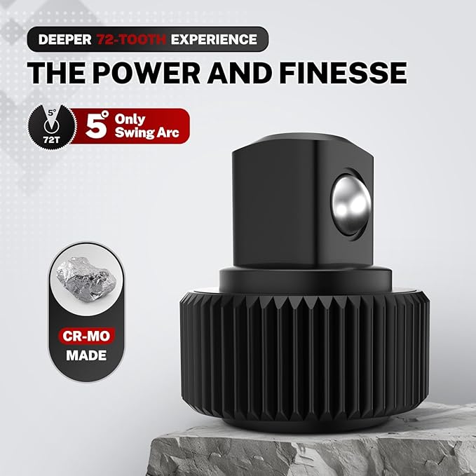 - [PROFESSIONAL DESIGN] The ratchet head reversible 72-tooth gear only needs a 5-degree swing arc to operate. The quick-release reversible head design is used to replace the socket by touching the middle part, and the driving direction can be changed by flipping the biased drive switch.