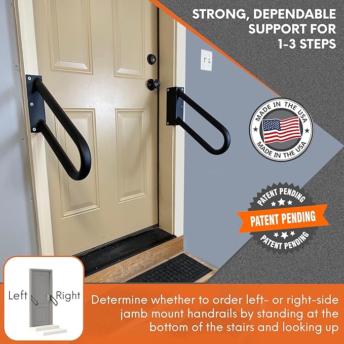 - SUPPORT WHERE YOU NEED IT: Using our patent-pending mounting bracket, each hand railing provides added stability—whether you're living with a disability or have limited mobility due to age. Featuring a non-slip grip, this black heavy-duty door jamb mount provides an extra layer of strength and durability.
