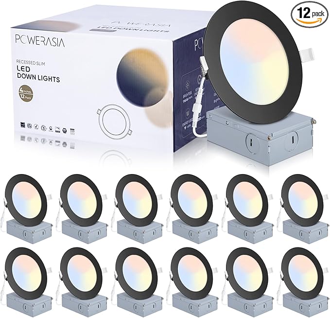 12 Pack Recessed Lighting 4 Inch with Junction Box, 5CCT 4 Inch Black LED Recessed Lights Dimmable 2700K/3000K/4000K/5000K/6000K, 9W 700lm Ultra Thin Recessed Lighting - ETL and Energy Star Certified