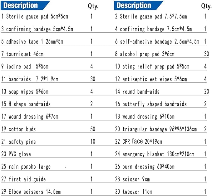 - ✅: Our first aid kit includes 30 sets of 180 pieces of medical supplies. With 8'' x 6'' x 3.5'' overall dimension the kit weights only 1 lb. Water resistant nylon case and it protect your medical supplies. It's light, and is all organized nicely. The kit also offer extra space to add your own stuff.