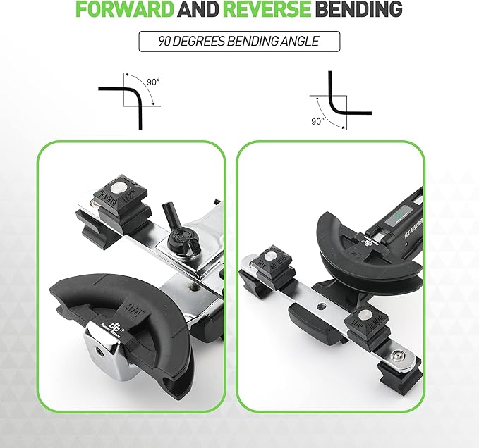 - 2-stage design allows for bends from 90 degrees to 180 degrees without ever crossing handles; easily lock/unlock bender with a half-turn rotation of the bending handle