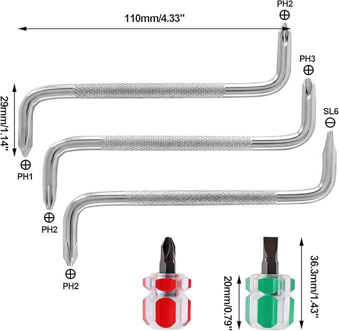 - Practical Screwdriver Set: Package includes 3 pcs offset screwdriver (PH2/SL6 , PH2/PH1, PH3/PH2) and 2 pcs mini screwdriver (6x14mm phillips head and flat head). Comes with plastic box for easily storaging and organizing.