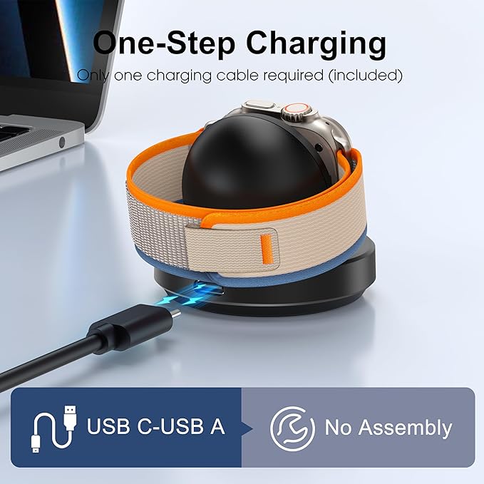 - One-Step Charging Stand: Simply place your Apple Watch upright on the dock to start charging, no installation required, very easy to use. With 20s blue indicator light which means your watch starts to charge, and it will cut off automatically when your watch is fully charged. (Note: The power adapter is not included, you may need a USB A port adapter)