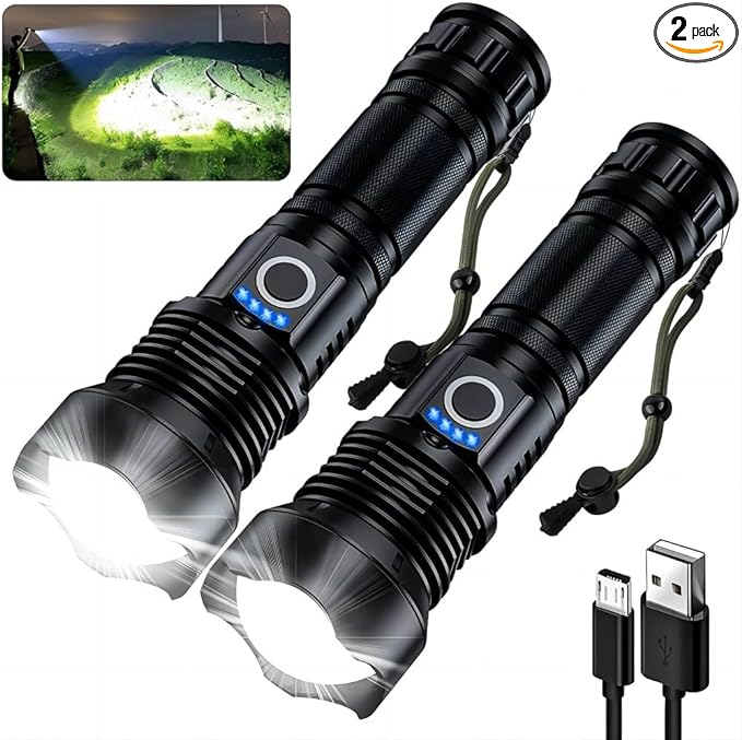 Rechargeable Flashlights 90000 High Lumens - 2 Pack, Super Bright 12 Hours Long Life LED Flashlight with 5 Modes, High Powered Flash Light for Home, Outdoor (Black)