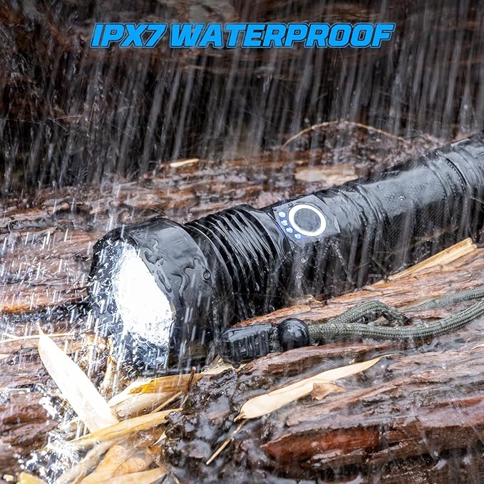 - 【IPX7 Waterproof】This super bright rechargeable flashlight shell is made of advanced materials, and the back cover is sealed to maximize the waterproof function, so there is no need to worry about the short circuit caused by the water entering the flashlight in outdoor use. Our waterproof flashlight is the best choice for your outdoor flashlight, it is stress-free to use in rainy and snowy weather.