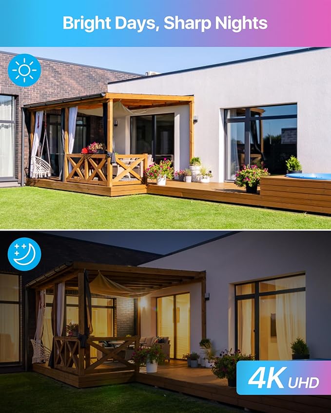- 【4K Ultra High Definition and Color Night Vision】This ultra HD 4K CMOS image sensor allows the camera to capture more light,which improves color,contrast,and low-light performance. Up to 100ft night vision and with advanced starlight sensors can see brighter full-color nighttime videos, providing users with crystal-clear footage during day and night.