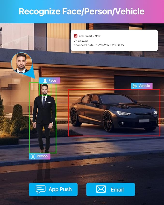 - 【Face/Person/Vehicle Detection & Smart Alerts】Our AI-powered detection feature intelligently identifies faces, people, vehicles, or other objects, reducing unnecessary notifications. You will receive instant App push notifications, email alerts and sound alarms (siren) when motion events are detected.