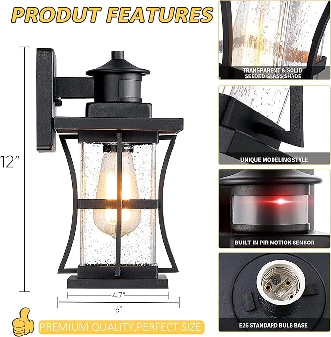 - 【Super Easy to Install & E26 Standard Bulb Socket & Well Packaged】The dusk to dawn motion sensor porch lights are not only both aesthetics and functionality but well constructed. The black front doorway lights are pre-assembled, no extra installation is required, just put in any bulb that meets the E26 socket. In order to let you enjoy the finest shopping experience and reduce the trouble, we pack the products tightly to ensure that you can get the perfect outdoor motion sensor wall light!
