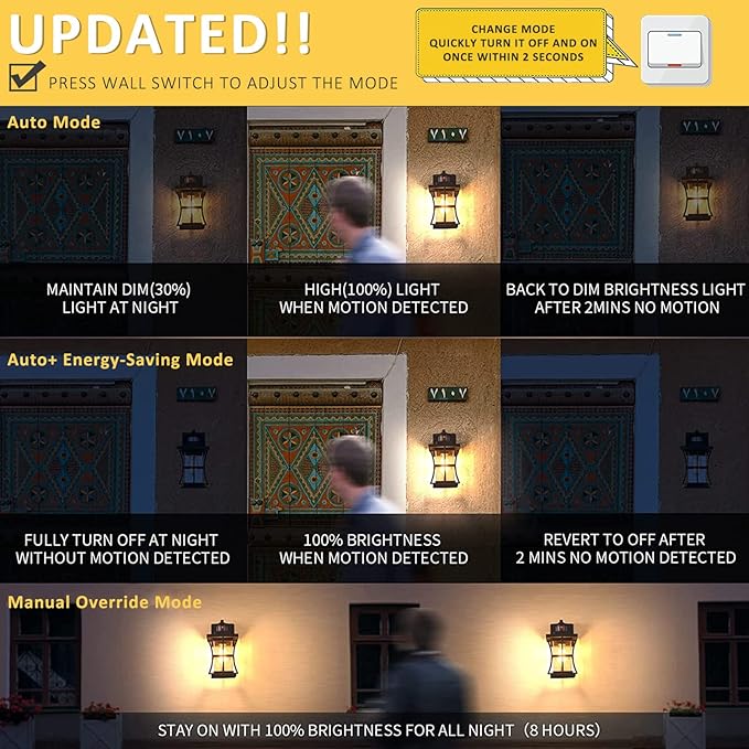 - 【Smart PIR Motion Activated & Dusk to Dawn IC Sensor】 Advanced outdoor lights have 3 modes of smart lighting. The motion sensor is programmed to be auto and have options to meet your need. ①The exterior wall light could be fully off with no motion-activated and turn to 100% brightness once motion is detected. ②The porch light keeps low light with no motion activated at dusk, activated with 100% light, and back to low brightness after 120s. ③It also can stay on 100% brightness at night for 8Hs.