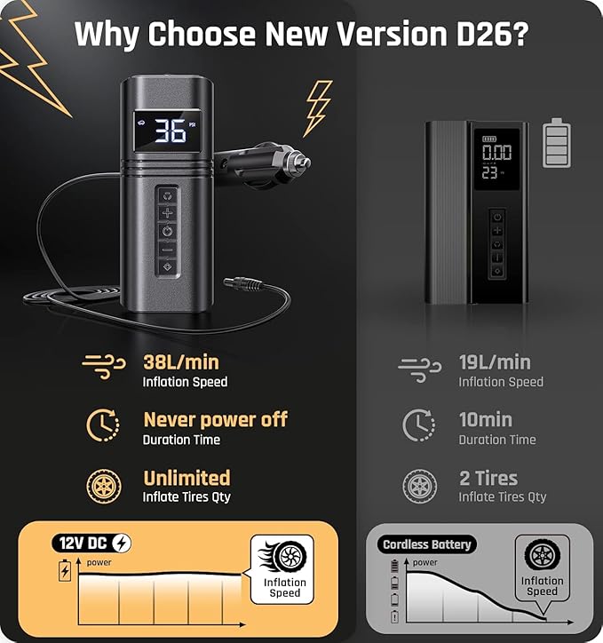 - Extraordinary Power with Small Size: Especially equipped with a 24-cylinder air cylinder which provide maximum pressure of 150 PSI and airflow of 38L/Min! ! Just plug our car tire inflator into the 12V Cigarette lighter, less than 5 mins to fully inflate a car tire (0-36PSI) or 1 min to refill car tire in daily situation (28-35PSI). (Mark: Testing data base on a flat standard tire 185/65/R15)