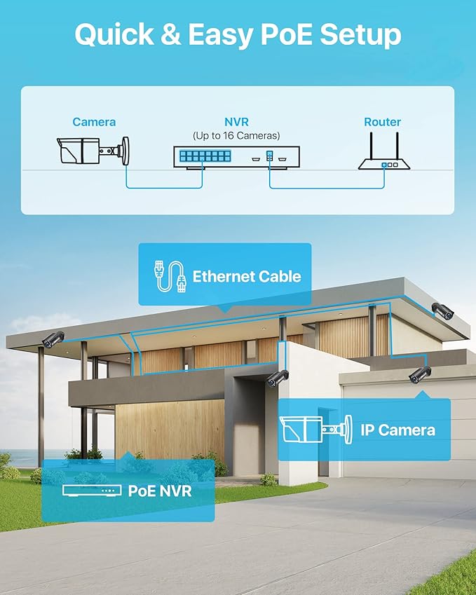 - (4). [ Simple Plug & Play PoE Setup ] __ A single network cabling provides both video and power to your cameras, eliminating the need to install them near a power outlet. This wired connection offers a more stable and reliable solution compared to wireless security systems.