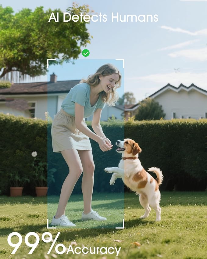 - [Advanced PIR Motion Detection & Real-Time Alerts] The spotlight security camera illuminates the surrounding area when motion is detected. With advanced motion and AI human detection, you’ll receive real-time alerts, ensuring timely notifications on your phone, wherever you are. Additionally, this wireless outdoor camera offers three alarm options: siren, spotlights, and app notifications.