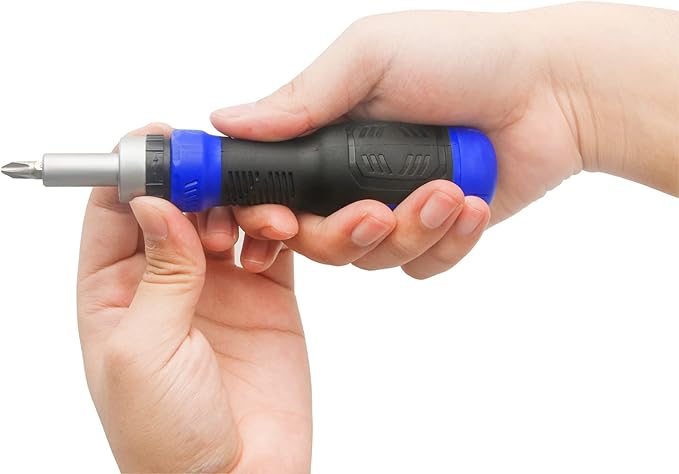 - 【Space Saver】Ratcheting screwdriver set stores 12 changeable tips in the handle with an integrated bit holder. It's convenient to screw off the end cap and switch the bits. The screw driver handle is 5.90" length, takes up very little space, fits into pocket, also suit for EDC, kitchen drawer, tool belt, tool box or backpack