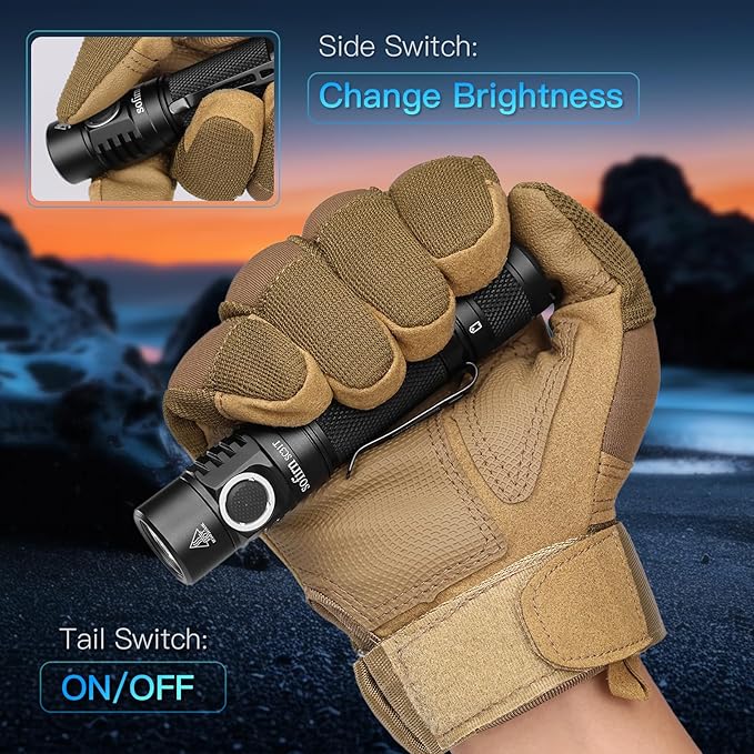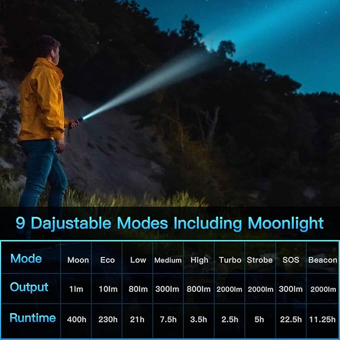 - Super Bright Powerful Flashlight: The Sofirn SC31T led tactical flashlight, equipped with a powerful LED, emits up to 2000 lumens of light, reaching an impressive throw distance of 209m / 685ft. It features 9 adaptable settings: Eco, Low, Medium, High, Turbo, Moon, Strobe, SOS, and Beacon.