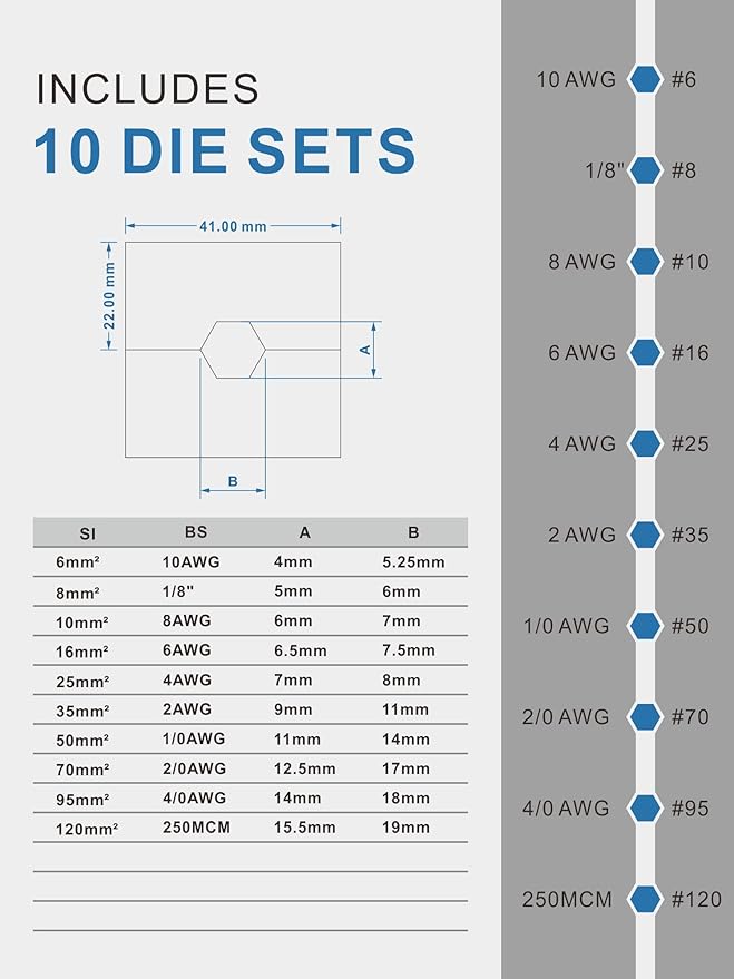 - Hydraulic crimping tool 9 pairs of dies: 8 AWG,6 AWG,4 AWG,2 AWG,1 AWG,1/0 AWG, 2/0 AWG,3/0 AWG,4/0 AWG.