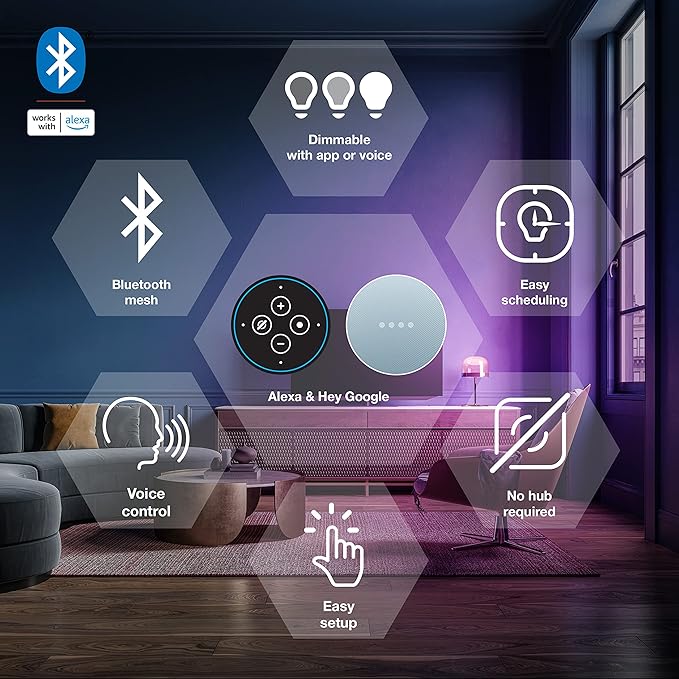 - BLUETOOTH LOW ENERGY (BLE) MESH BULB-TO-BULB CONNECTIVITY - Connect hundreds of bulbs, extend your voice control ability beyond wifi dead zones, each Bluetooth bulb acts as its own hub beyond the Alexa Echo device.