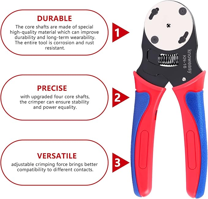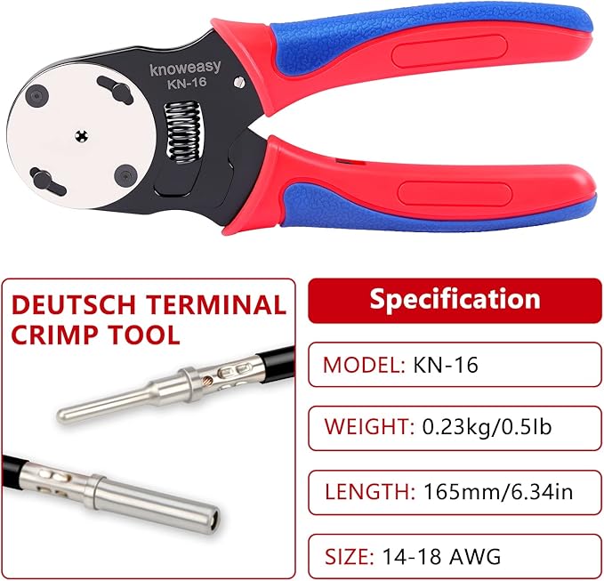 - 【Versatile Crimping Tool】: The Knoweasy KN-16 Crimping Tool is designed for 14, 16, and 18 gauge (Contact Size 16) closed barrel terminals from Deutsch and Amphenol. Ideal for electrical repairs and automotive applications